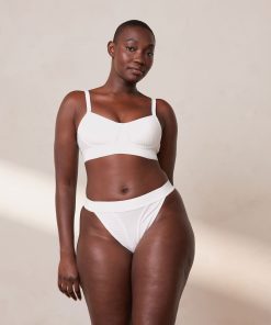 Light foam padded bra, no wire Comfort-first ribbed fabrication Hook and eye fastening Silver Lounge engraved hardware Minimal supportive Lounge banner 91% Recycled Polyester, 9% Elastane Our Bare Set has been designed so you can embrace your beauty in its purest form. Bare skin, fresh faced and beautifully you, this bare underwear set works like magic.