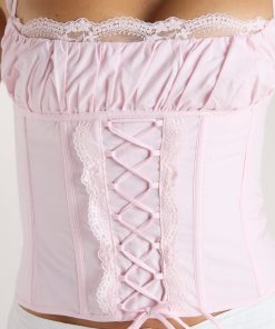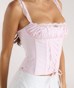 Non-wired corset top Ruched detail to bust Fully boned Full cotton lining Lace trim detail to neck edge, centre-front, and straps Lace-up corset detail to centre-front Zip fastening to back Elasticated, adjustable straps Silver engraved hardware Part of ‘Sophia u0026amp; Cinzia for Lounge’ |Your favourite brand just launched a collection with your favourite influencers. Step into Sophia u0026 Cinzia’s world of floral patterns and pastel hues. Meet feminine designs that flatter the figure with this curation of corset tops and matching sets that you’ll adore. u003cbru003e The Belle Corset Top is a masterpiece in pink. Inspired by our decade-long mastery of contour and corsetry, this top fits like a dream.