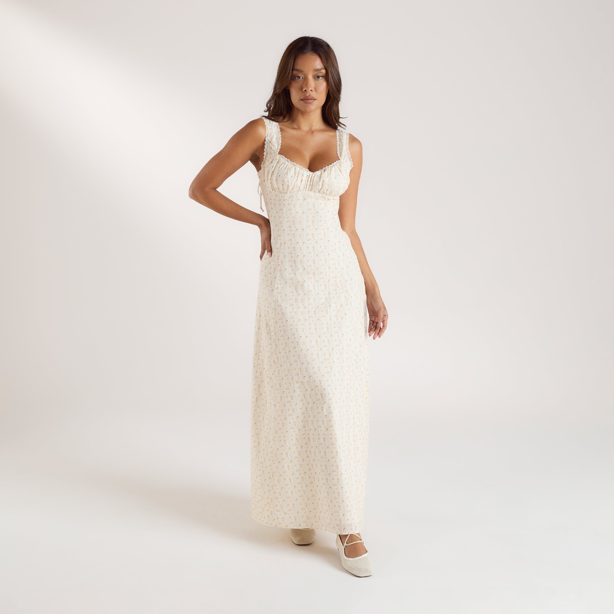Floor-length maxi dress Corset-style, no boning Ruched cup detailing Soft woven fabrication Lace trim to neck edge and shoulder Lined fabric with floral print detail Adjustable tie shoulder details Lace-up back detail Invisible zip fastening to side |The Al Fresco Collection marks a new chapter for Lounge. Blurring the lines between clothing and Intimates, each piece reflects Lounge’s evolution from lingerie pioneer to modern fashion house, dedicated to celebrating the female form. The Corset Back Maxi Dress leaves no detail unnoticed. This beautifully flattering piece has classic corset-style lacing, adjustable shoulder ties, and feminine lace trims, creating a piece that belongs in every summer wardrobe.