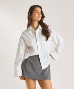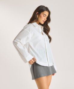 Structured cotton shirt Wide drop-shoulder sleeves Angled cuff opening with engraved buttons Curved hem to front and back with small side panels Front placket to hide buttons Front pocket with chain-stitch logo detailing Yoke to back with pleat detail |The Debut is a collection of tailored clothing designed to bring a flair of modernity to traditional shapes. Discover staple pieces that slot effortlessly into any wardrobe, with each piece crafted for quality, fit, and longevity. Lounge is now worn to be seen. u003c/bru003e Contour fashion makes way for high fashion with the introduction of the Cotton Shirt. This beautifully tailored piece shows a mastery of considered craftsmanship, with subtle branding and accents that are still unmistakably Lounge.
