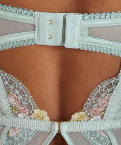 Balcony-wired bodysuit, no padding Three-piece cup Visual printed embroidery with sparkle lurex thread Flattering panels for a cinched waist effect Jacquard satin panels Jacquard satin binding finishes Mesh panels Cut-out details Decorative strap and picot elastic Organza and satin bow with embroidered floral charm with sequin bead detailing Gold engraved hardware Padded hook and eye fastening Metal swan hook fastening to centre-back G-string bodysuit |Feel the essence of summer with Midsummer Intimates. This enchanting collection blends traditional corsetry and innovative design to create lingerie that effortlessly flatters every figure. From signature three-piece sets to unique corsets and bodysuits, each set is hand-designed in Britain by an all-female team of lingerie experts. The Thalia Bodysuit is a vision in green. With soft pastel tones and delicate floral embroidery, this flattering bodysuit is the epitome of femininity.