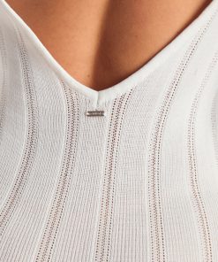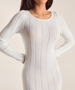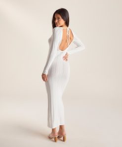 Fitted, scoop-back maxi style Lightweight, sheer knit fabrication Back tie detail Slit to hem Silver tab engraved with Lounge logo This is the dress you need in your suitcase. Whether you style over a bikini or your favourite lingerie set, this dress steals the show every time.