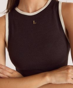 Knitted vest top Contrast-colour edge to neckline and arms Miniature gold ‘L’ logo branding to front-centre |Get inspired by this curated style guide to create the perfect look|The Dust and Daisies Collection celebrates unapologetic individuality and the art of self-expression. This collection of western-inspired clothing seamlessly blends oversized and fitted shapes, creating effortlessly flattering outfits.With a contrast-colour edging and a miniature gold pin, the Knitted Vest Top is an elevated staple. The sleeveless style is ideal for warmer days, while the knit fabrication makes it a perfectly transitional piece.