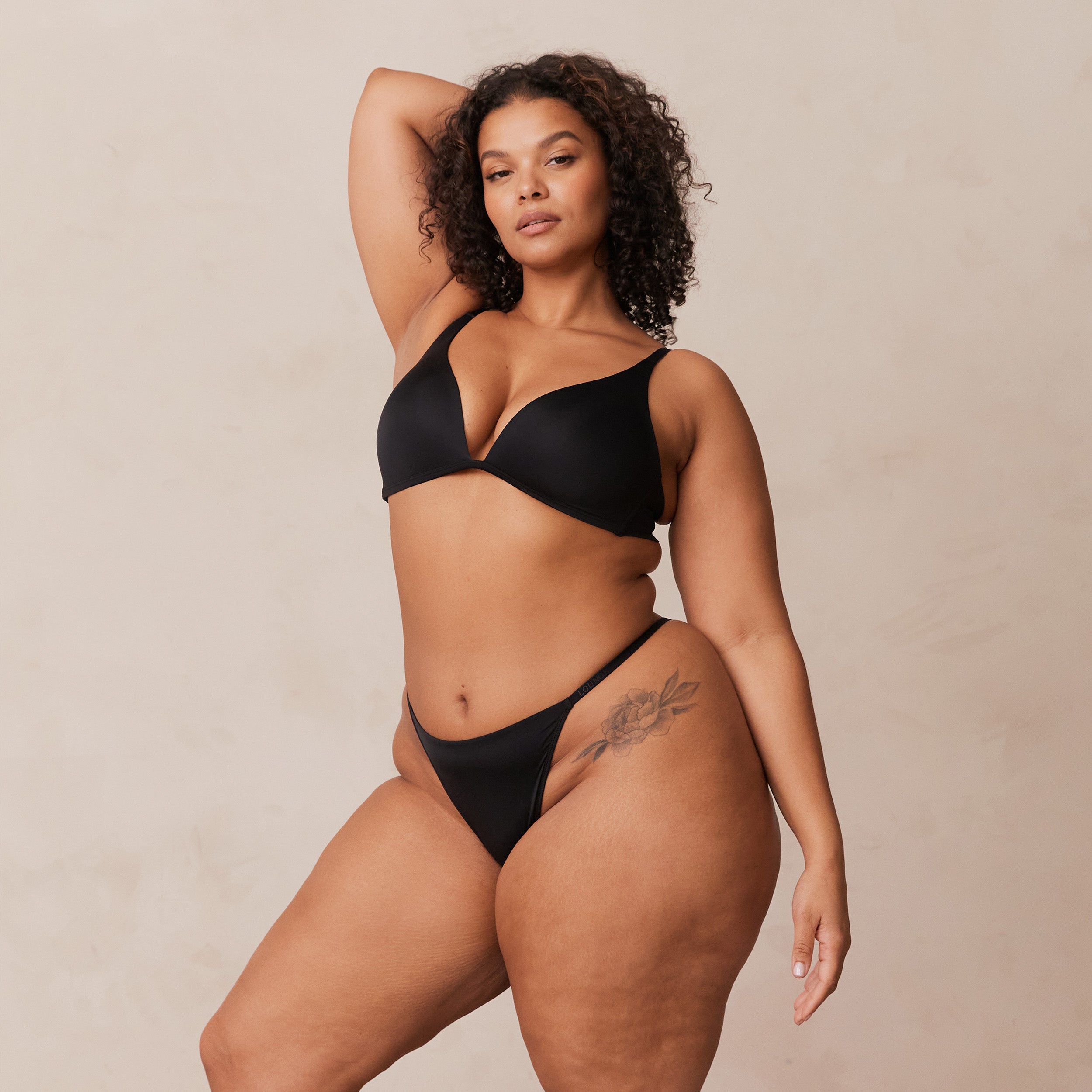 Non-wired bra, foam cup Super soft micro fibre fabrication, with seam free wings Elasticated Lounge branded straps Hook and eye fastening Silver Lounge hardware 79% Recycled Polyamide, 21% Elastane Introducing our Light Non-Wire Plunge Set. Featuring a soft smooth fabric and non-wired foam cup, this set will have you Lounging in comfort all day.