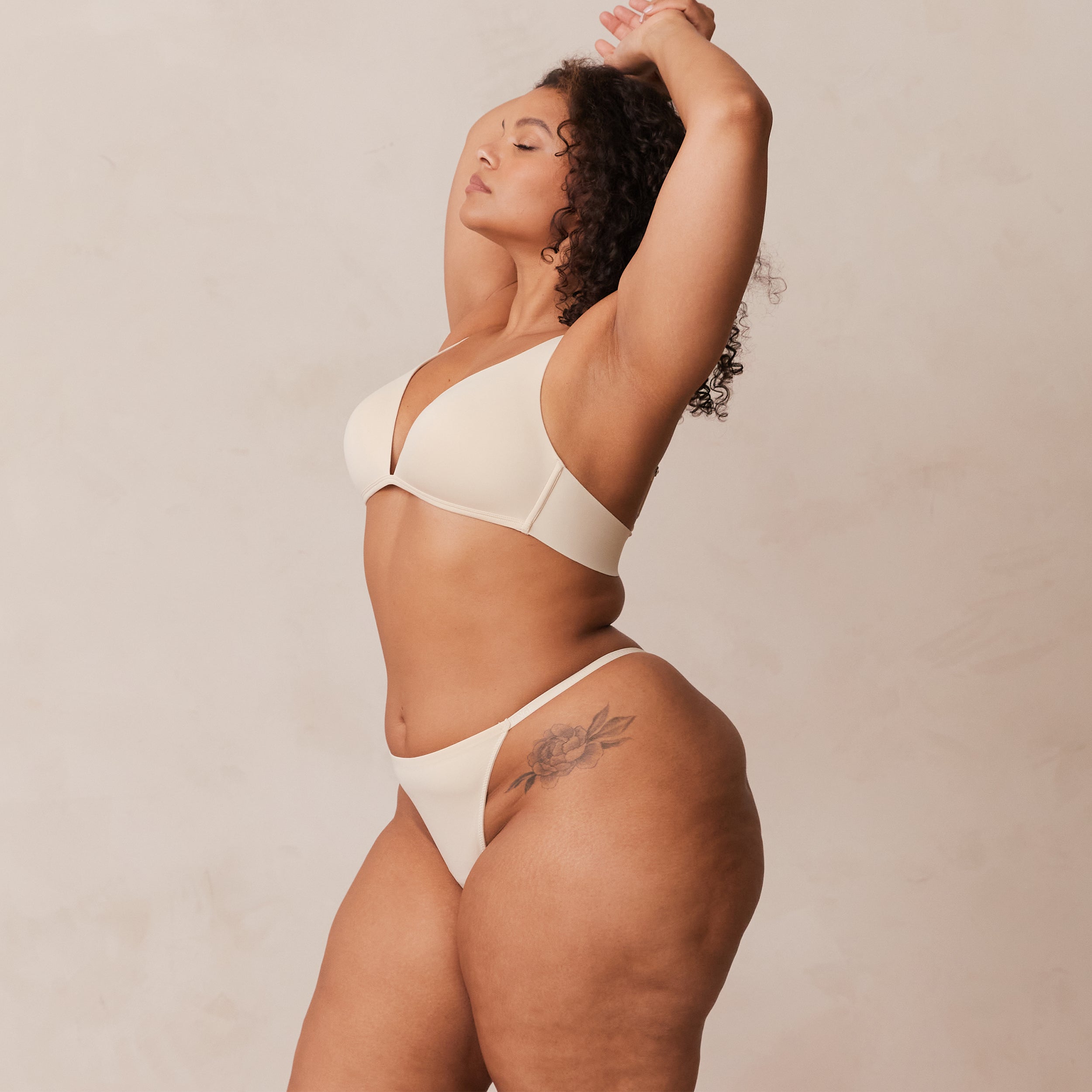 Non-wired bra, foam cup Super soft micro fibre fabrication, with seam free wings Elasticated Lounge branded straps Hook and eye fastening Silver Lounge hardware 79% Recycled Polyamide, 21% Elastane Introducing our Light Non-Wire Plunge Set. Featuring a soft smooth fabric and non-wired foam cup, this set will have you Lounging in comfort all day.