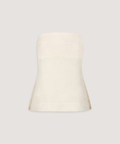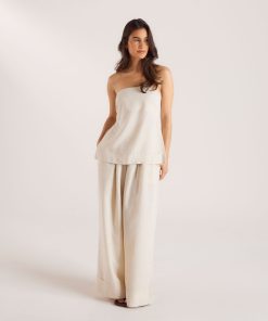 Tie-back bandeau top Open-back design Side slits Wide turn-back hem Darted details to bust Lining across bust for extra coverage Gold logo engraved tab to side |The Dust and Daisies Collection celebrates unapologetic individuality and the art of self-expression. This collection of western-inspired clothing seamlessly blends oversized and fitted shapes, creating effortlessly flattering outfits.The Linen Blend Bandeau Top, the first of its kind for Lounge, marks the turn of a new season as well as the turning of a page in Lounge’s history. This flattering piece, with a tie-back design and flattering darted details to the bust, is undeniably worn to be seen.