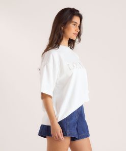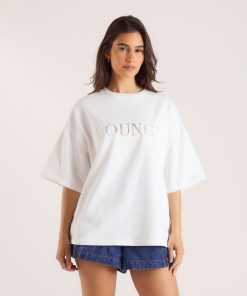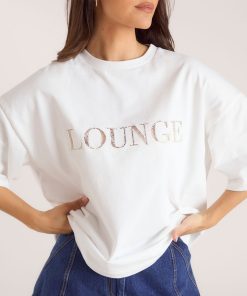 Relaxed, oversized style Soft-stretch cotton fabrication Ribbed neckline Dropped-shoulder style Lounge logo to front with reverse appliqué lace design |Get inspired by this curated style guide to create the perfect look|The Dust and Daisies Collection celebrates unapologetic individuality and the art of self-expression. This collection of western-inspired clothing seamlessly blends oversized and fitted shapes, creating effortlessly flattering outfits.Designed with a sheer logo to allow for a glimpse of the lingerie worn underneath, this oversized T-shirt offers a hint of sexiness without compromising on comfort.