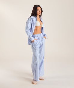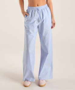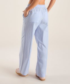 High-waisted, loose-fitting style Lightweight, soft fabrication Pockets Gathered waist with outer drawstring Lounge banner to inner waist, revealed when waistband is rolled down Perfect for morning espressos, evenings al fresco, and everything in between, these pinstripe trousers are everything you need this summer.