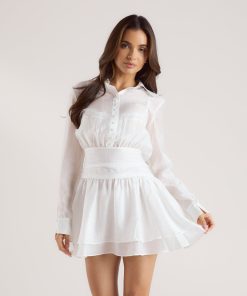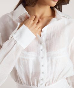Collared shirt dress Covered button fastening to front Gathered waist detail Sheer shirt Double-layered skirt for added coverage Long sleeves with button cuff fastening Zip fastening to side seam Gold logo-engraved tab to neck |Get inspired by this curated style guide to create the perfect look|The British Garden Collection celebrates the best of British fashion design. Every piece in this collection pays homage to our roots in lingerie design, offering a whimsical take on trending shapes. Step into a new season with garments that blur the line between lingerie and clothing. This dress is everything you love about Lounge – with a few more layers. The sheer top allows you to show off your lingerie underneath, while the practical double-layered skirt adds coverage for wearability. The subtle gold branding and flattering details are signature features of a Lounge classic.