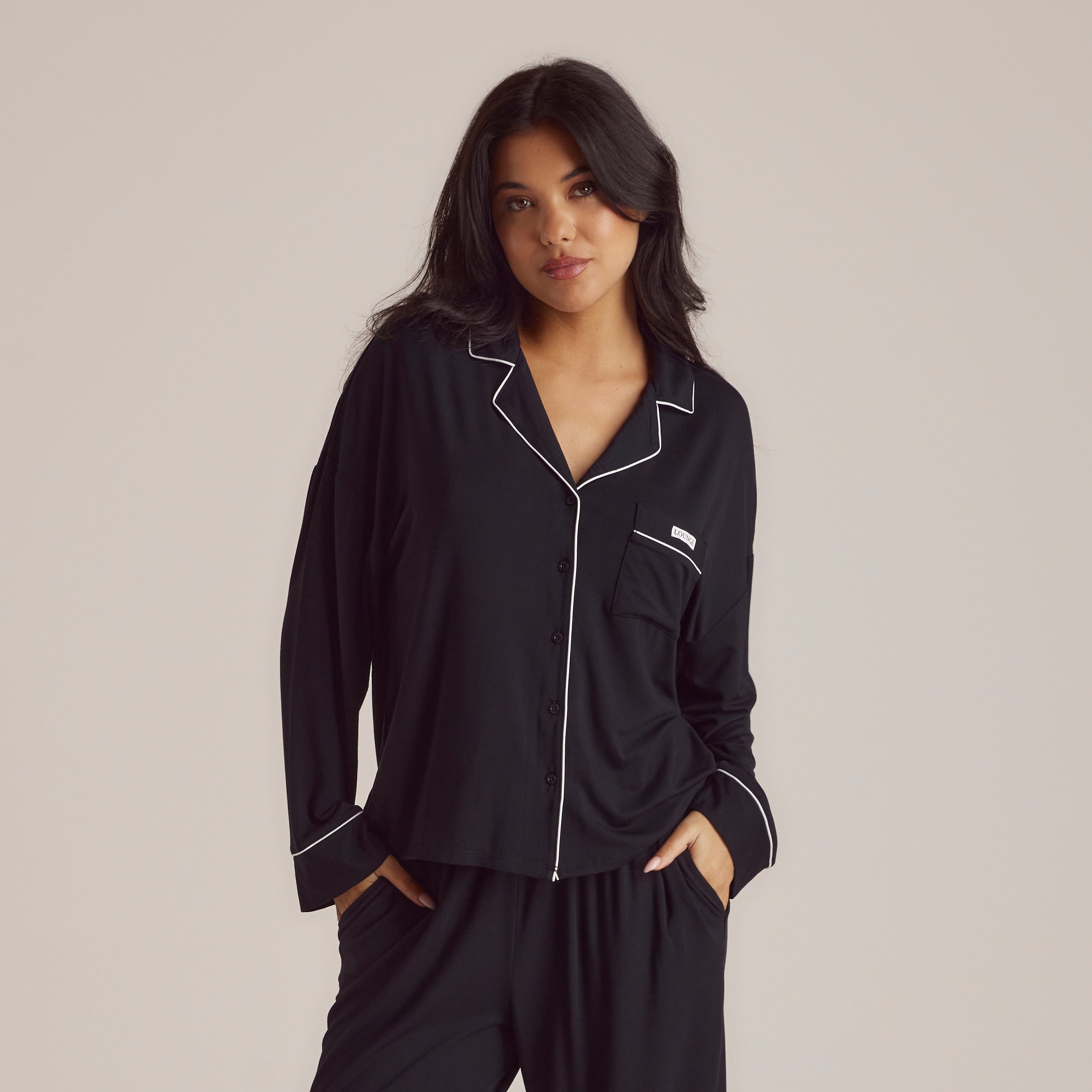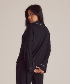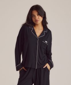 Ultra-soft pajama shirt made of smooth modal fabric Soft-stretch fabrication Buttons engraved with Lounge logo Piping detail to cuffs, collar, and front seam Front pocket to chest Woven tab with Lounge logo to front pocket
