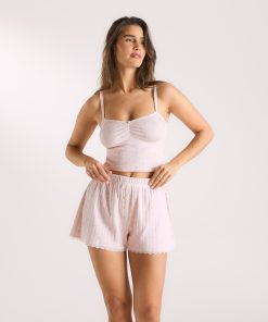 Soft pointelle fabrication – 205 GSM Ruching detail to centre-front for added shape Woven label with Lounge logo to side Rosebud detail to centre-front Lace trim to neckline |The Spring Daze Collection embodies the turn of a season and the transition to a colourful springtime wardrobe. With soft pointelle pieces in seasonal pastel shades, nothing says ‘spring’ quite like this collection The Pointelle Cami Pyjama Top is the perfect transitional layer: simply too pretty to be worn as just sleepwear, this piece promises a season of comfort wherever it’s worn.